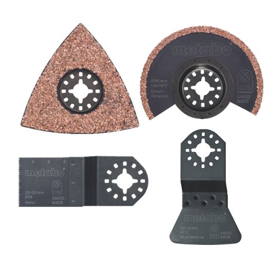 Set bestehend aus: 1 x Segmentsägeblatt 85 mm HM (Fliesen), 1 x Dreieckschleifplatte 78 mm HM (Fliesen), 1 x Schaber starr 52 mm HCS, 1 x Tauchsägeblatt 32 mm BiM (Metall)