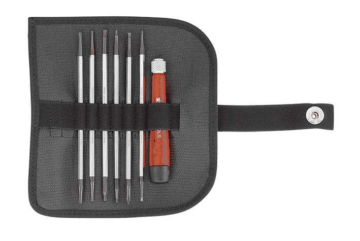 mit Teleskop-Griff und Duplex-Wechselklingen, in kompakter Kunstleder-Rolltasche, für kleine Schlitz-, Phillips-, Torx®- und Innensechskant-Schrauben, präzise, massgenaue Spitzen, optimaler Sitz in den Schrauben, Teleskopgriff, stufenlos einstellbare Klingenlänge, mit drehbarer Kappe, für feine Schraub- und Justierarbeiten