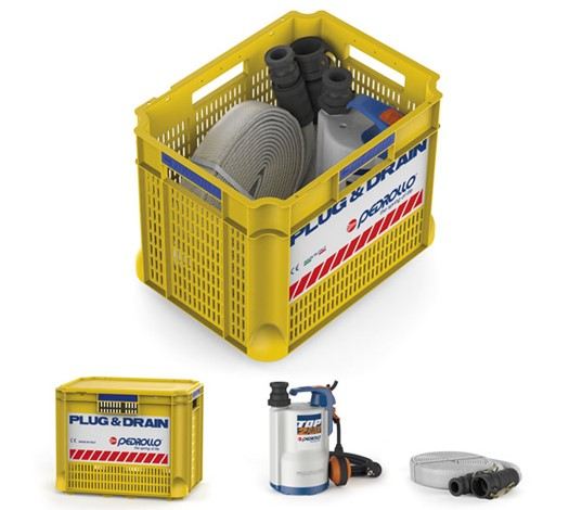 Mit PLUG & DRAIN können Sie den betroffenen Bereich vollständig entleeren bei Überflutung: Die Pumpe kann tatsächlich Wasser bis zu einer Höhe von nur 2 mm überhalb des Bodens entwässern.