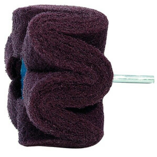 Besteht aus mehreren stark gewellten Schleifvliesstreifen, die um einem Kern gewickelt sind