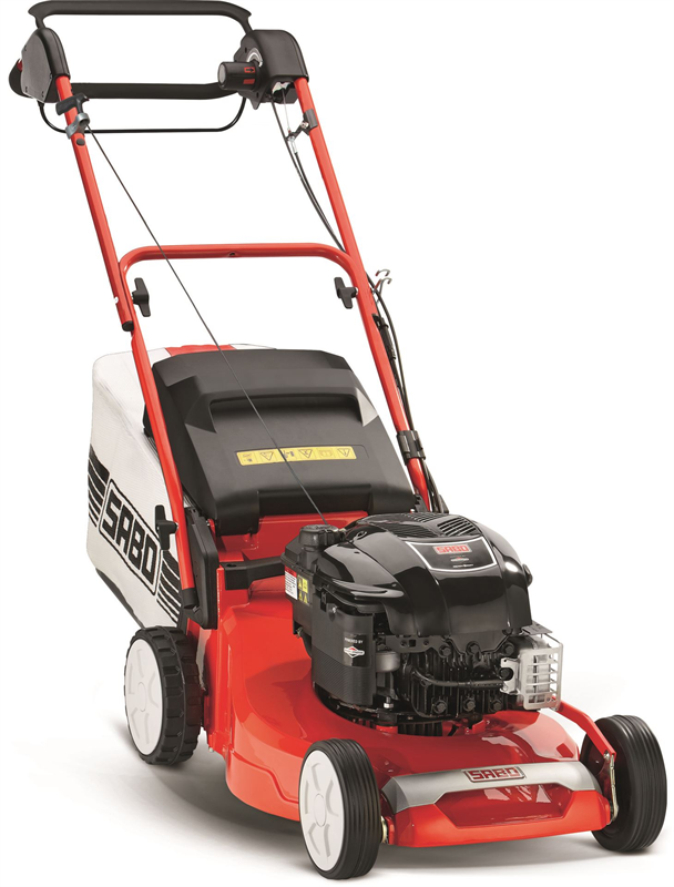 Alle Ausstattungsmerkmale eines echten SABO: Alu-Chassis, zentraler Schnitthöheneinstellung, verstellbarem Führungsholm und kräftigem Motor, jedoch mit zuschaltbarem, variablem Hinterradantrieb. Ideal für Flächen bis 1500 m2