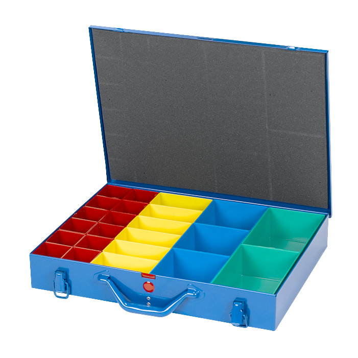 Startseite » Steigtechnik - Transportroller - Werkbänke - Schubladenschränke - Regale - Stapelbehälter - Magazine » Kleinteilkoffer » Sortimentskoffer aus Stahlblech