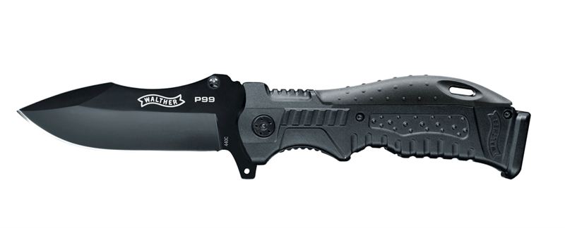 Die markante Spearpoint-Klinge aus 440 Stainless Steel ist schwarz beschichtet und aufgrund ihrer wuchtigen Ausführung in Verbindung mit der außergewöhnlichen Klingenstärke und der geschwungenen Form des Klingenrückens ein echter Eyecatcher. Die Riffelung des Klingenrückens wird auf der Beschalung weitergeführt und bietet dem führenden Daumen somit sicheren Halt. Wie auch bei der P99-Pistole ist der Griffrücken des P99 Knife austauschbar und lässt sich somit an die Handgröße des Anwenders anpassen.